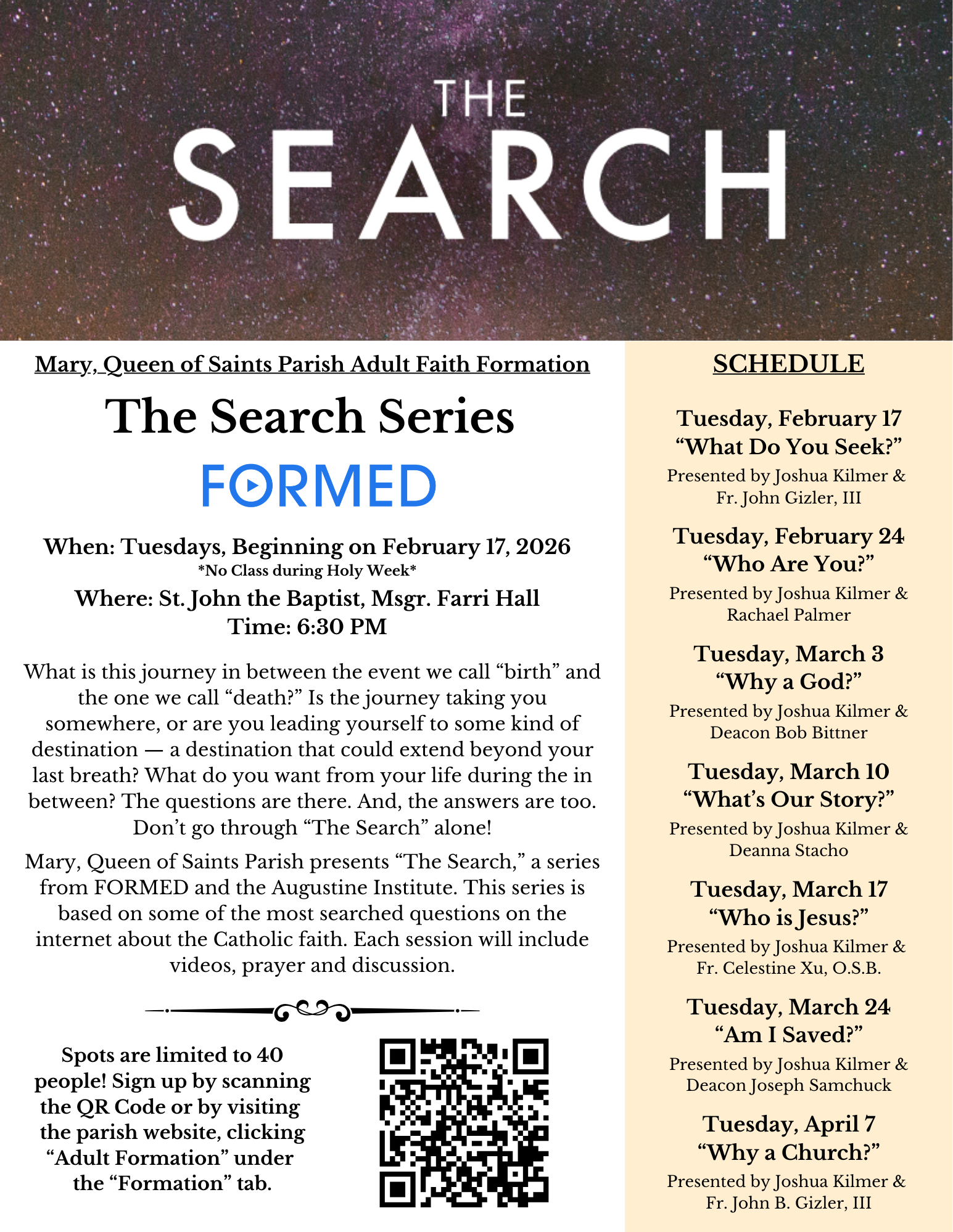Mary, Queen of Saints Parish presents “The Search,” a series from FORMED and the Augustine Institute. This series is based on some of the most searched questions on the internet about the Catholic faith. Each session will include videos, prayer and discussion. Additionally, each session will be led by MQS Adult Faith Formation Director, Joshua Kilmer, and a member of the MQS Clergy or Pastoral Staff.