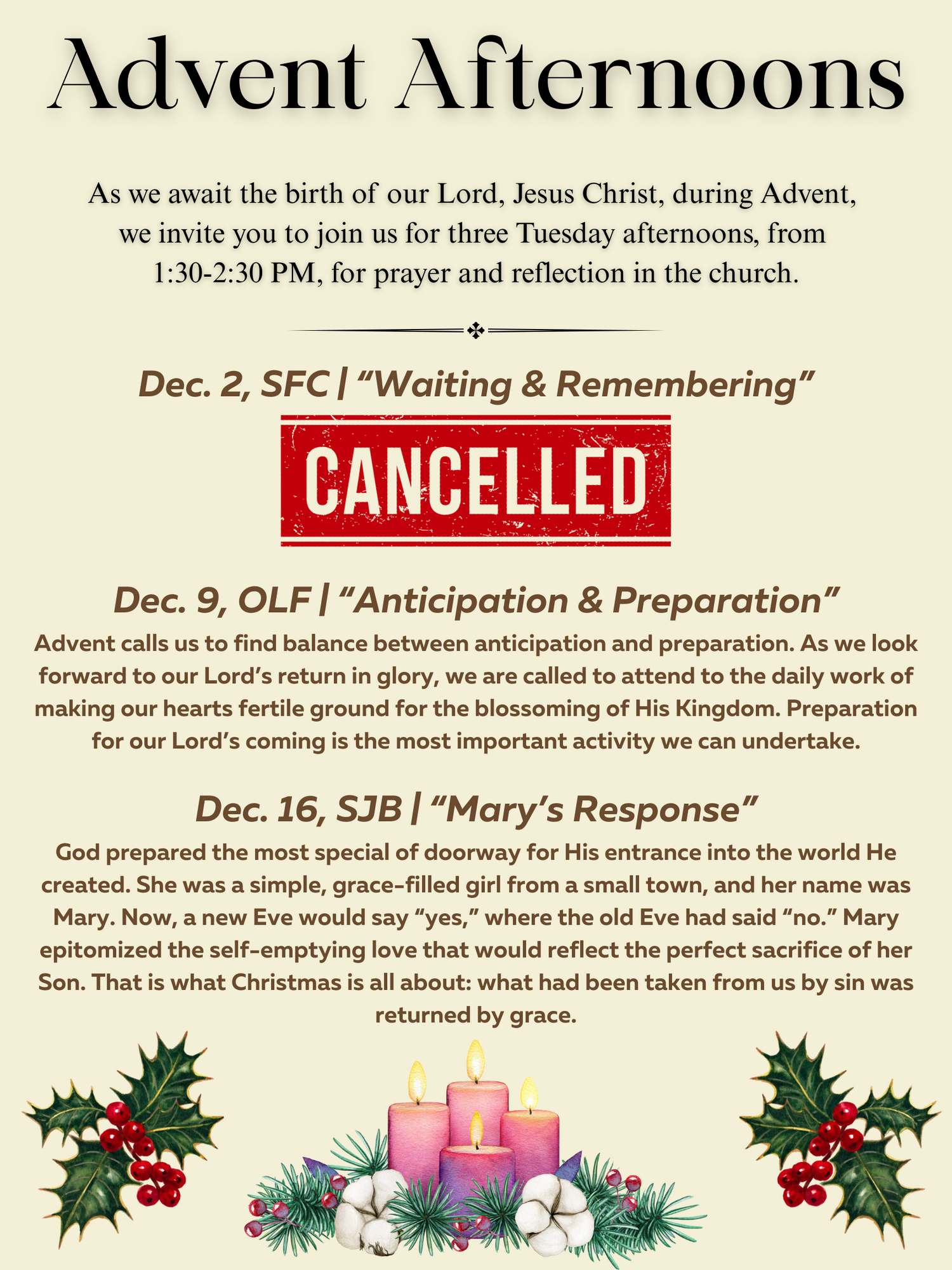 We hope you will join us on Tuesday, December 9, for "Anticipation and Preparation," at Our Lady of Fatima Church, beginning at 1:30 PM.