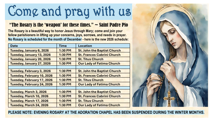Please note, the evening Rosary at the Adoration Chapel has been suspended during the winter months.